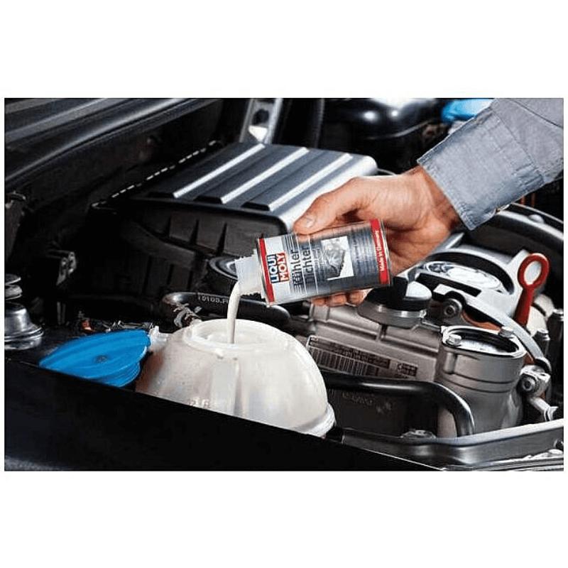 Não é fácil localizar as pequenas fugas causadas por golpes de cascalho, pontos de soldagem porosos ou pequenas fissuras no sistema de refrigeração em motores refrigerados com água (apenas se vê o nível do líquido de refrigeração a baixar). Este agente dispersivo veda imediatamente este tipo de fugas a 100%, protegendo a câmara de combustão contra danos causados pela entrada de líquido refrigerante. É compatível com todos os transformadores de líquido refrigerante e líquidos anticongelantes comuns. Também se pode utilizar preventivamente.